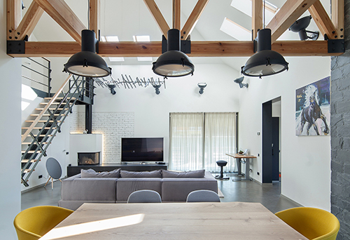 Salah satu ide menarik, plafon di rumah ini dibiarkan terbuka sehingga kuda-kuda kayu yang cukup besar menjadi point of interest tersendiri. Dengan begitu, void rumah pun semakin lapang sehingga udara panas semakin tersingkir. Terdapat pula skylight sehingga sinar matahari semakin berlimpah.