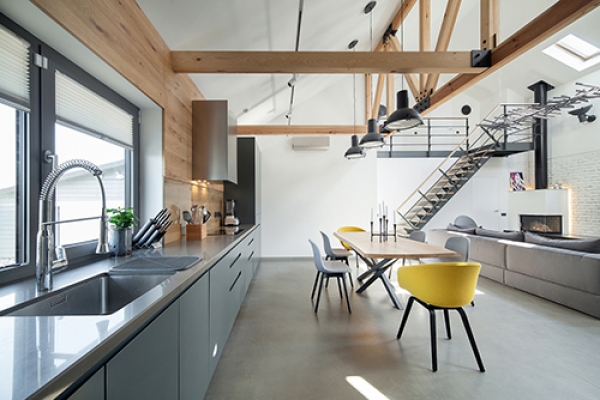 Warna hitam terlihat dari lampu bergaya industrial di atas meja makan dan juga di sekeliling dinding rumah. Tak cuma itu, warna hitam juga terdapa di credenza TV hingga tangga yang menuju loteng.
