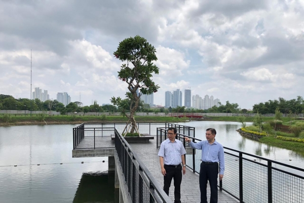 (dari kanan ke kiri) Harto Laksono selaku Direktur Marketing dan Edison Tan selaku GM Marketing PT Intiland Grande meninjau fasilitas danau yang dekat dengan lokasi pengembangan klaster terbaru Graha Natura, Surabaya.