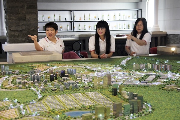 Tampak dalam gambar (Kiri-Kanan): Christine Natadipraja, President Billionaire Club PT Modernland Realty Tbk. didampingi Helen Hamzah, Director Marketing Urban Development PT Modernland Realty Tbk. dan Feriyawati Surja, Technical Director Urban Development PT Modernland Realty Tbk. berdiskusi bersama saat mengamati maket pengembangan township Modernland Cilejit (7/10).