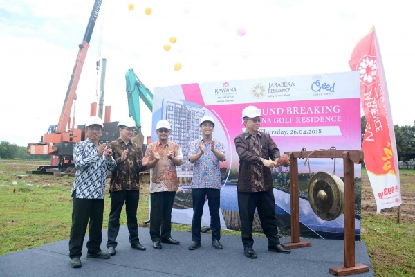 Tampak dalam gambar Presiden Direktur PT Jababeka Creed Residence, Lim Seng Bin sedang memukul gong sebagai tanda dimulainya groundbreaking