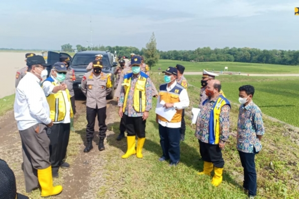 JAKARTA- Menteri Pekerjaan Umum dan Perumahan Rakyat (PUPR) Basuki Hadimuljono melakukan pengecekan Bendungan Cipancuh di Gantar, Indramayu terkait bencana banjir di wilayah sekitarnya pada Rabu (10/2/2021). Dari hasil kunjungan, Menteri Basuki menginstruksikan segera dilakukan perbaikan kerusakan akibat terjadinya pergeseran dan amblasnya tanggul luar bendungan tersebut.