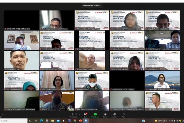 Sebagai informasi, Direktorat Jenderal Perumahan Kementerian PUPR telah melaksanakan kegiatan Konsultasi Publik Rancangan Peraturan Menteri PUPR tentang Pelaksanaan Bantuan Perumahan sudah dilakukan sebanyak tiga kali secara daring. Pelaksanaan Konsultasi Publik I untuk wilayah Sumatera dan Jawa pada tanggal 25 Februari 2022 dan Konsultasi Publik II pada tanggal 4 Maret 2022 untuk wilayah Kalimantan, Bali, NTB dan NTT. Sedangkan pelaksanaan Konsultasi Publik III untuk wilayah Sulawesi, Maluku, dan Papua dilaksanakan pada tanggal 16 Maret 2022.